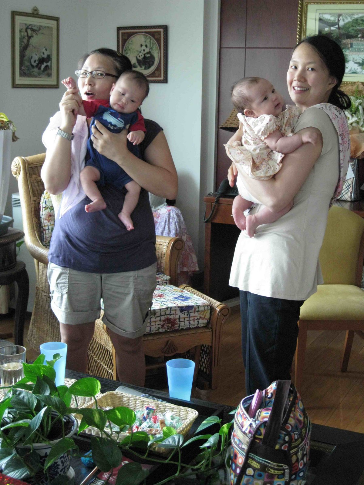 Well as I'm moving more away from work, I'm getting a chance to meet some really cool moms and moms to be. It started small of course with a few woman from one of my prenatal classes - they were nice enough to include the "teacher." Since May or so we have taken turns hosting a mom's group at our homes. As we continue to have babies and meet other people around Shanghai our group has gotten a little bigger not only with the addition of babies but since I will be the last one to deliver in the original group, I wanted to even out the score and have a few more pregnant mamas join the group. This week was my turn to host since I figured next month I'd be busy. :) We had 6 babies and 12 adults. It was a little crazy and now I'm exhausted, but thought I'd post a few pictures from our little get together. That and since there is one picture of me at yes, 34 weeks, now you all can stop bitchin' that I haven't posted any new pictures of myself.