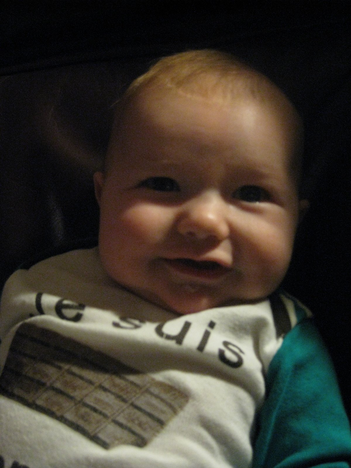 The other picture is of me in my new Bumbo seat! I can practice sitting up and start banging my hands on the tray table! Fun!