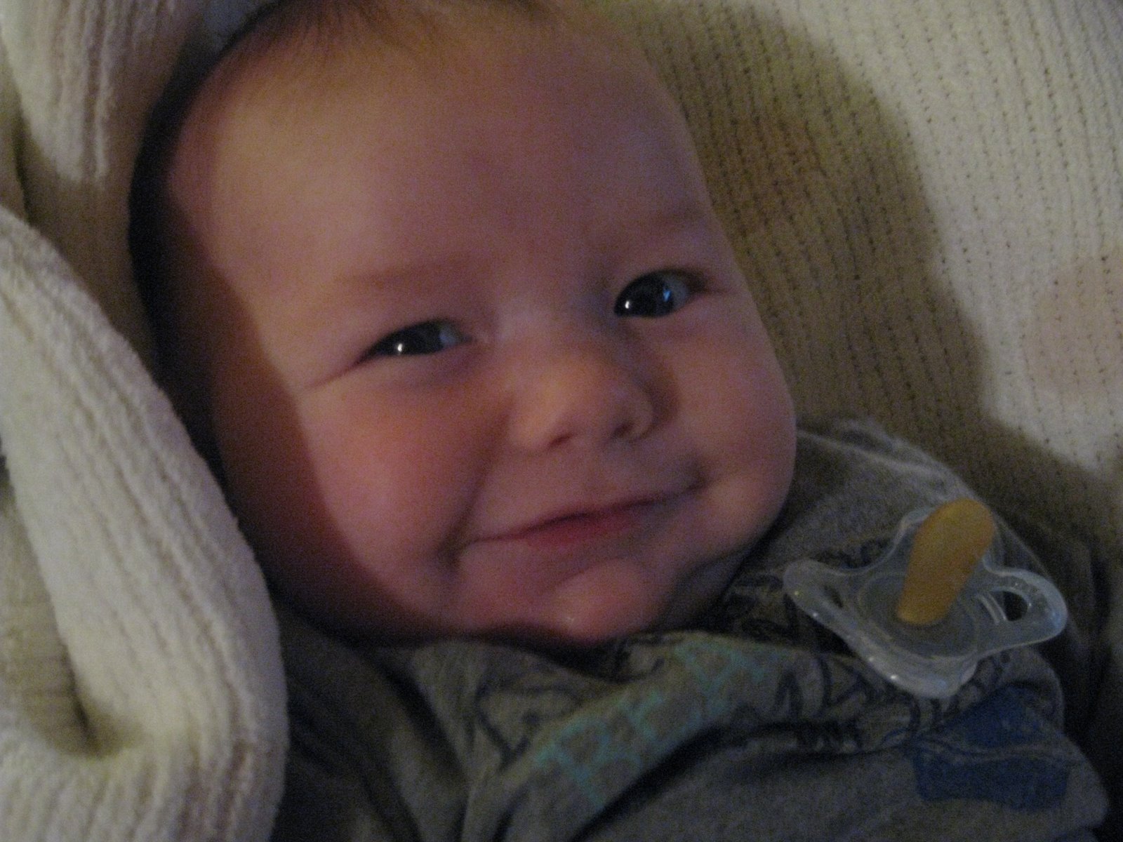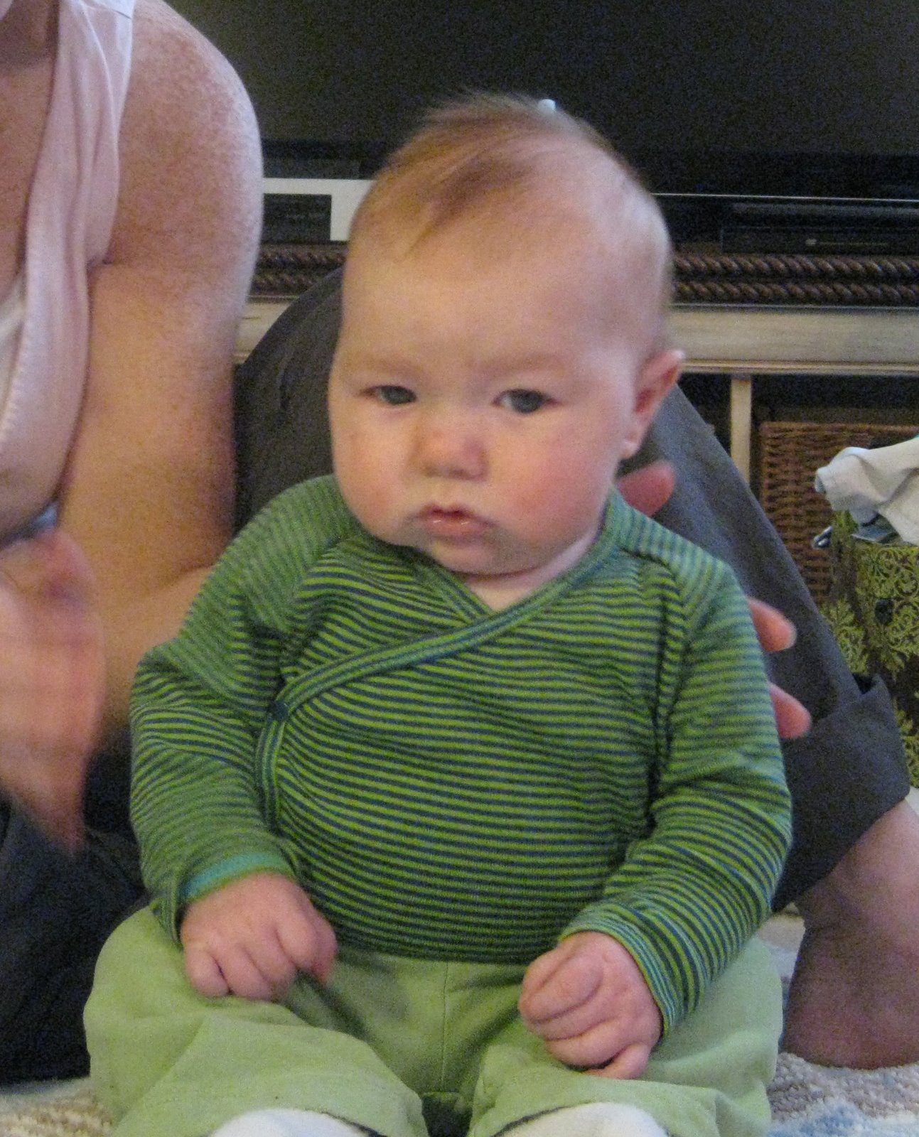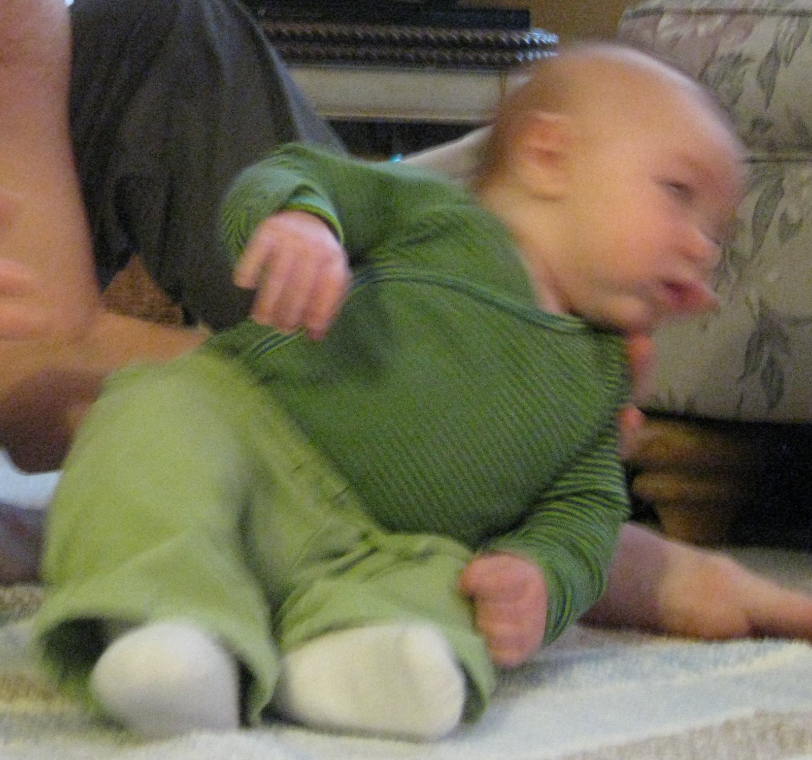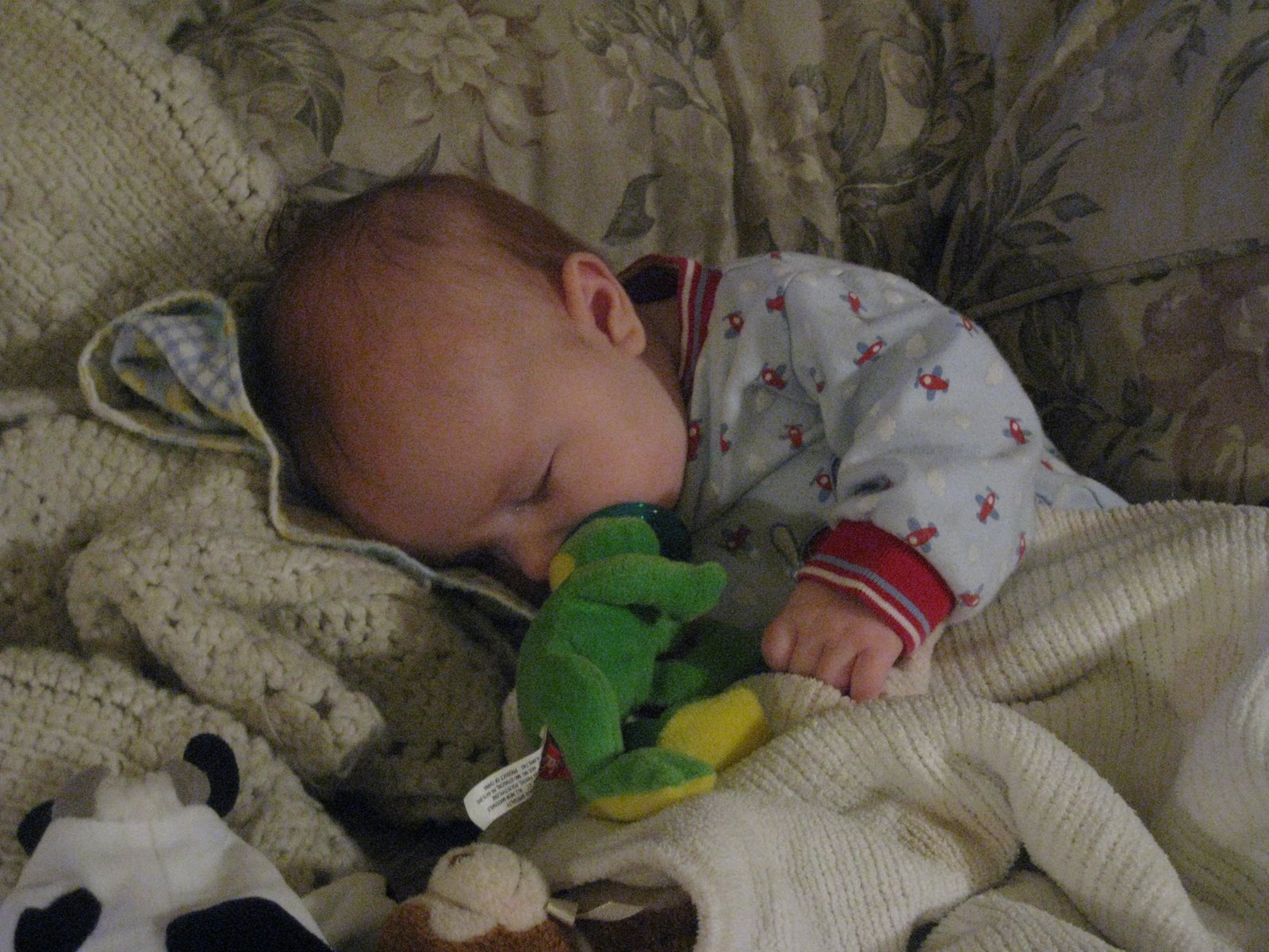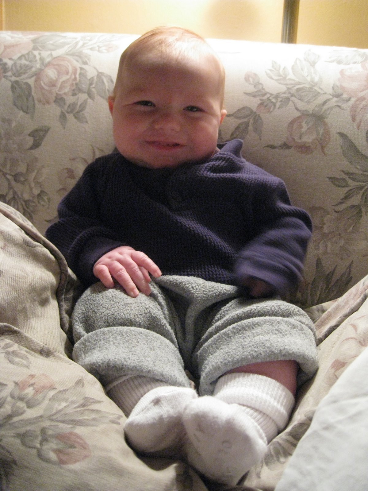 ...with a little help from my wubbanub "frogger" - no one was holding me and I was not being fed - okay, so I polished off a 6oz bottle of mom's good stuff about 45 minutes before ! We were practicing sitting up and I was getting cranky, so mom put me on the couch and I thought wow - this is much easier and much more comfortable than the floor - but then it was just too comfortable and I decided to take a few sucks on my pacifier and then tip over and crash out on the couch.